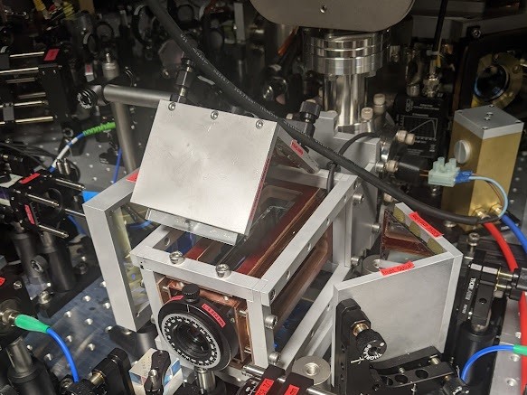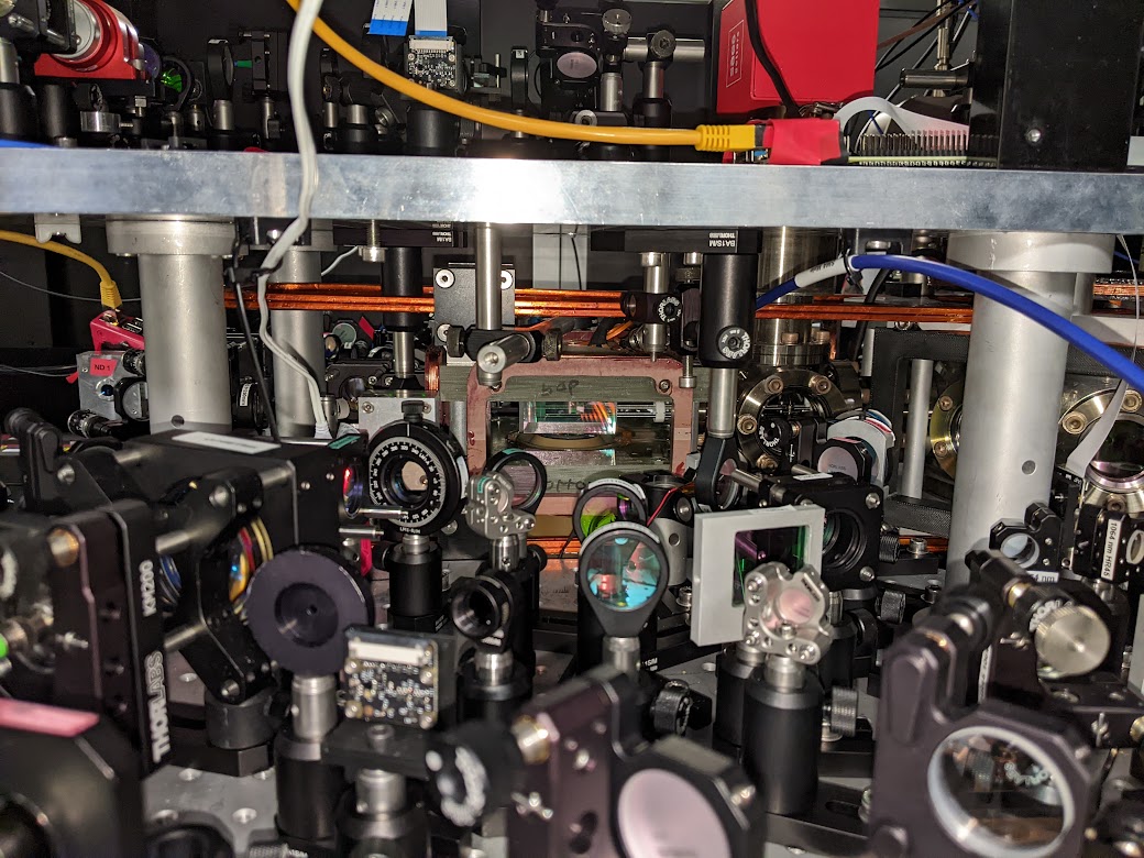 Science cell microscope objective which we use for quantum gas microscopy (centre). The optics around the cell are used for evaporative cooling of the atoms and forming the optical lattice used for single site resolved imaging.